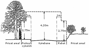 Træer og buske skal være beskåret så der altid er en frihøjde - eksempelvis over kørebanen på 4,20m. Husk at grene hænger lavere ned i fugtigt vejr.